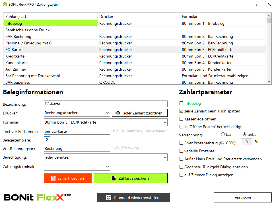 Es sind bereits standardmäßig Zahlungsarten vorgegeben, welche man 1:1 so übernehmen kann. Sie müssen lediglich jede Zahlungsart einem Drucker zuordnen.
