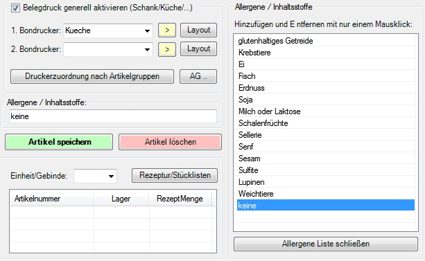 Im Artikelstamm können Sie bei jedem Artikel die Allergene im Feld "Allergene / Inhaltsstoffe" hinterlegen. Klickt man in das Feld erscheint eine Auswahlliste wo man komfortabel alle Allergene wählen kann. Oder Sie geben Ihre Informationen einfach manuell in das vorgegebene Feld ein.