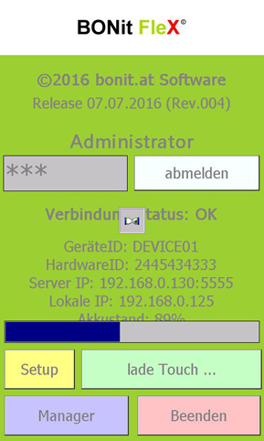 Nach dem Start von BONit FlexX Mobile gelangen Sie in den Startschirm. Hier können Sie sich als Benutzer anmelden. In das Setup gelangen Sie ohne Benutzeranmeldung - hier werden die Verbindungsparameter eingestellt. Wie das funktioniert finden Sie im Kapitel 8.1