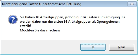 Die Menüführung (Sprungtasten) wird anhand der definierten Artikelgruppen erstellt. Je nach Ansichtsart (Normal, 2-Reihen Hybrid oder 3-Reihen Hybrid) stehen 18, 14 oder 12 Tasten und somit auch nur 12 Sprungebenen zur automatischen Verteilung zur Verfügung. Wählen Sie Ihre Artikelgruppen also schon vor der Artikelanlage mit Bedacht, wenn Sie diese Funktion verwenden möchten.