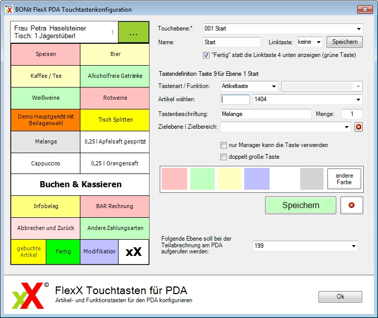 Beim drücken der xX Taste (FlexX-Taste) oder beim ersten Einstieg in eine Tischbuchung gelangt man immer in die Touchebene 1. Sie sollten diese daher so gestalten, dass Sie von der Ebene 1 aus alle anderen Ebenen erreichen können (Sprungtasten). Weitere wichtige Ebenen können Sie wie oben beschrieben für die Menütaste einrichten. Sehen Sie sich einfach den Demodatensatz an, dort sind alle möglichen Tastenkombinationen ersichtlich.