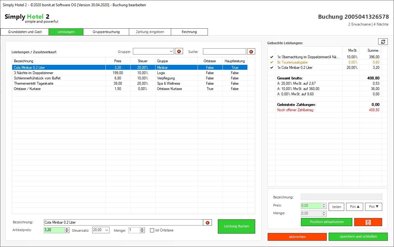 Nun buchen wir noch eine Leistung auf. Die Familie möchten gelich von der Rezeption ein Fläschchen Cola mitnehmen. Wir wechseln in den Reiter "Leistungen" und klicken einmal auf die entsprechende Leistung (Cola Minibar 0,2 Liter). Nun wird der Artikeltext, der Preis, die Menge (1) und der Steuersatz unten angezeigt. Mit einem Klick auf "Leistung buchen" wird das Produkt in die Zimmerbuchung übernommen. Sie können den Artikeltext, den Preis, die Menge und die Steuer jederzeit ändern oder überschreiben und so auch Artikel und Leistungen buchen die nicht fix angelegt wurden.